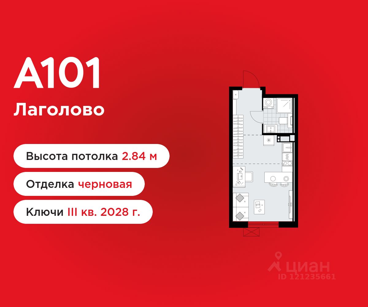 Студия площадью 23.61 в ЖК "А101 Лаголово" на 4 этаже. Квартира без отделки. Вид из окна во двор. В квартире 1 санузел. Высота потолков 2.84 м.
