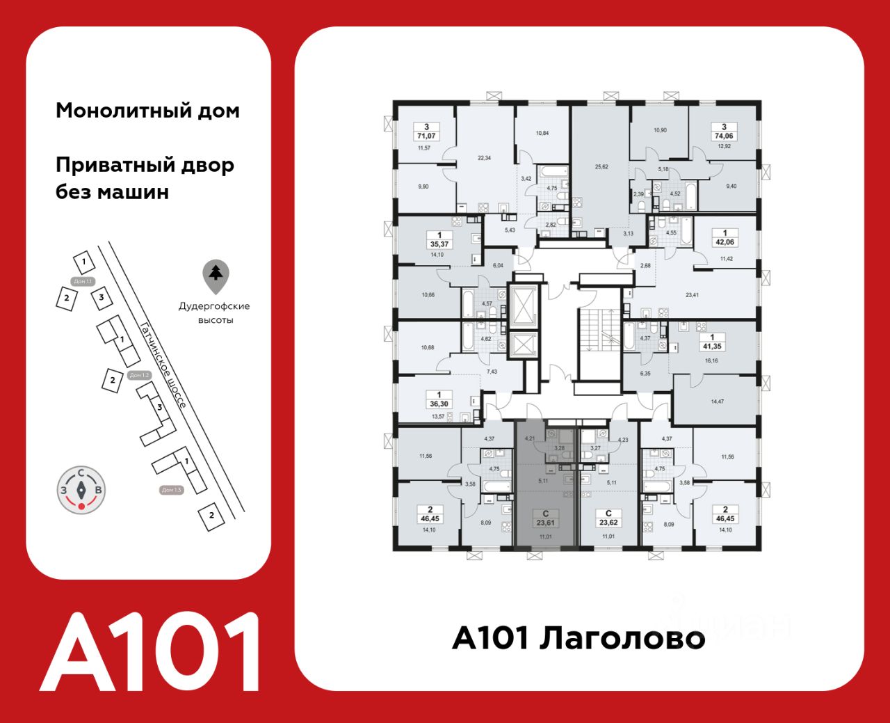 "А101 Лаголово" - современный город у подножия знаменитых Дудерговских высот, в объятиях чистейших озер и зеленых живописных массивов, наполненный всем необходимым для счастливой жизни.