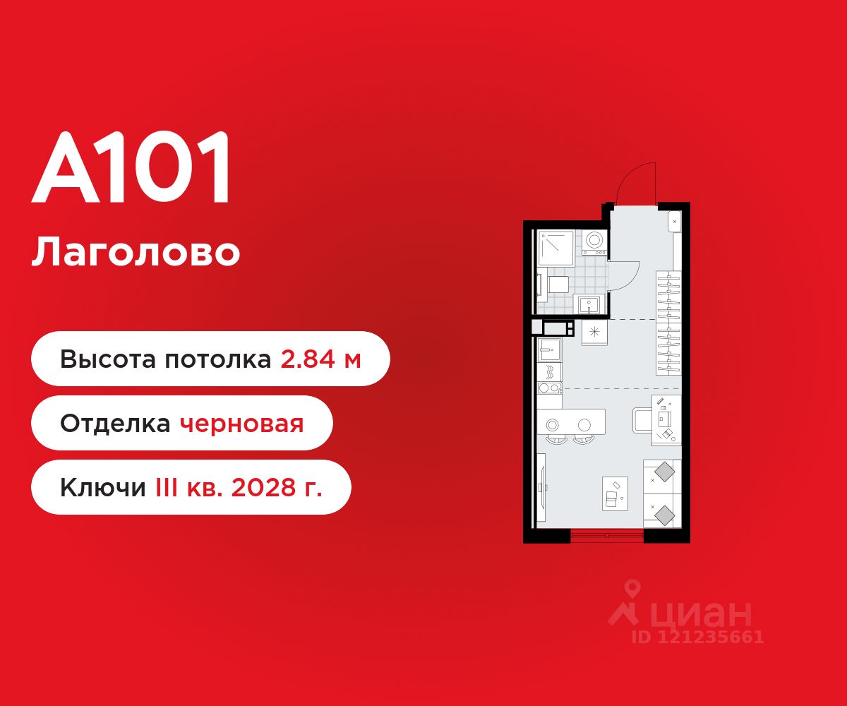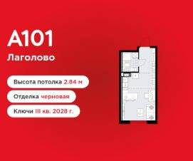 Студия площадью 23.62 в ЖК "А101 Лаголово" на 7 этаже. Квартира без отделки. Вид из окна на улицу. В квартире 1 санузел. Высота потолков 2.84 м.