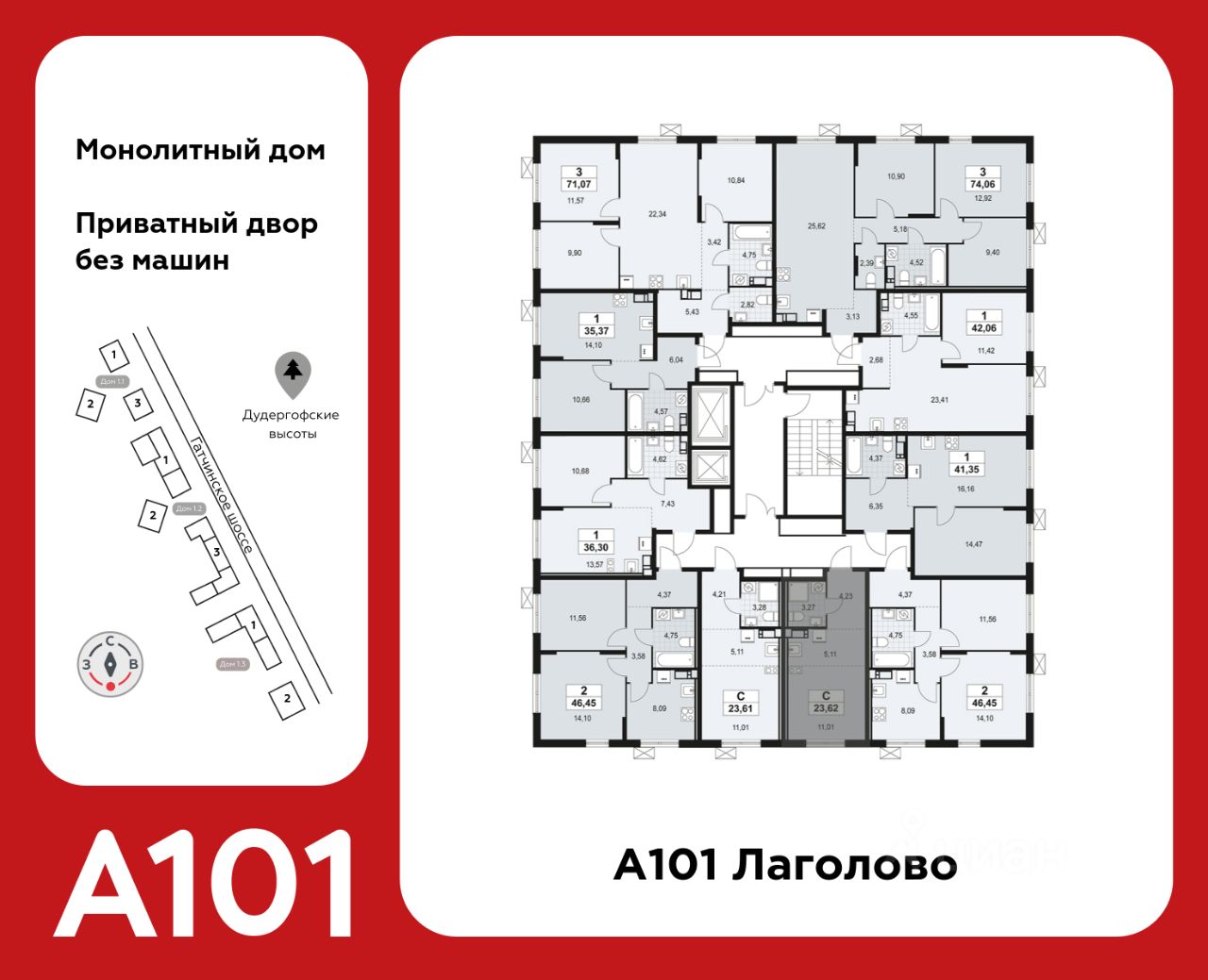 "А101 Лаголово" - современный город у подножия знаменитых Дудерговских высот, в объятиях чистейших озер и зеленых живописных массивов, наполненный всем необходимым для счастливой жизни.