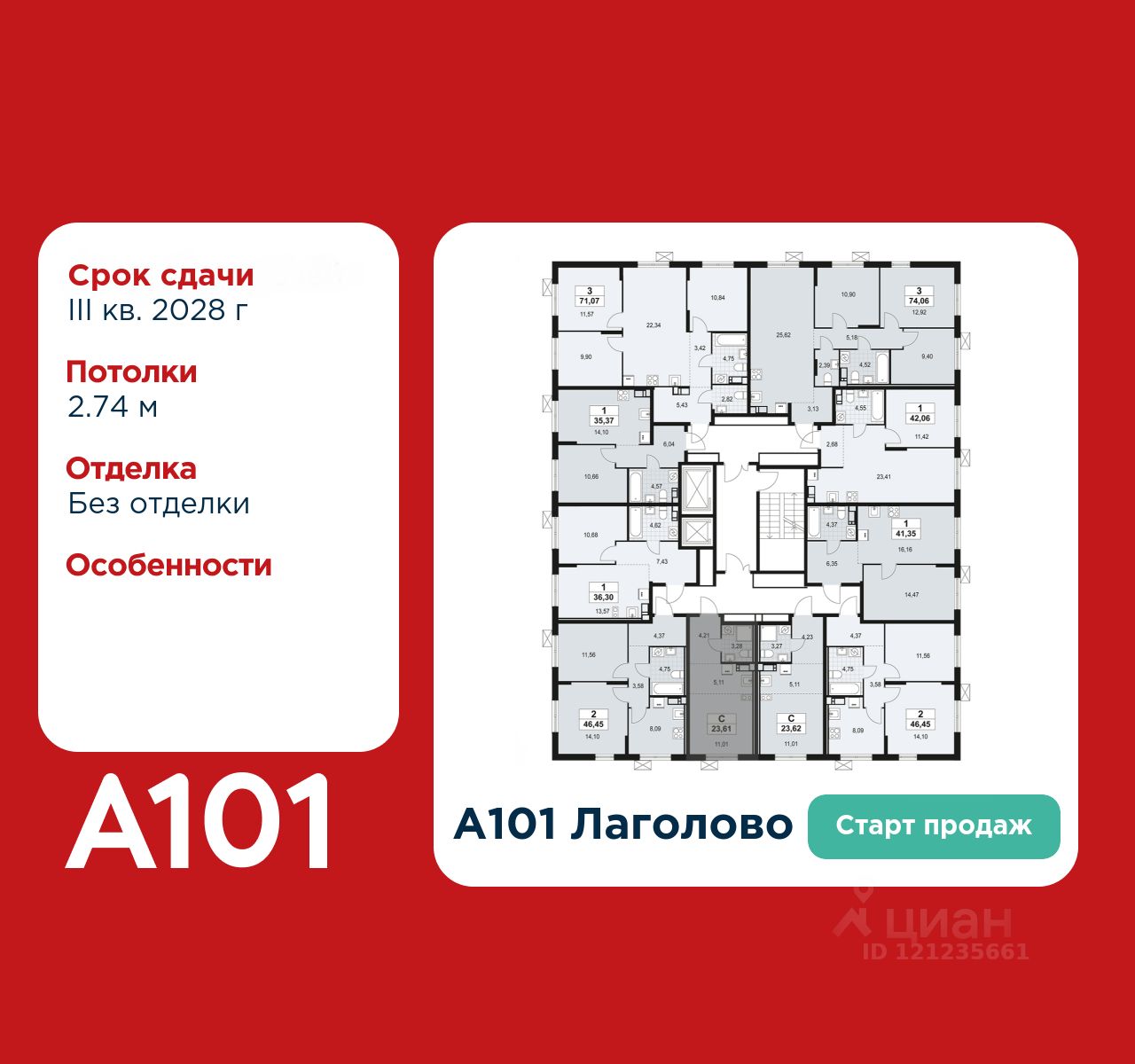 Студия площадью 23.61 в ЖК "А101 Лаголово" на 3 этаже. Квартира без отделки. Вид из окна на улицу. В квартире 1 санузел. Высота потолков 2.84 м.