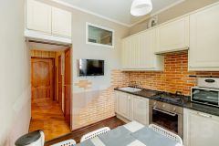 Общая площадь 57 м2, Кухня 7.8 м2. Высота потолков --3 метра. Раздельный санузел. Сделан хороший ремонт с заменой труб тепло и водоснабжения, в детской произведена шумоизоляция стен, замены окна. Много чего из мебели остается в квартире. Кухня Икея, встроенная техника, включая посудомоечную машинку. Газовая плита.