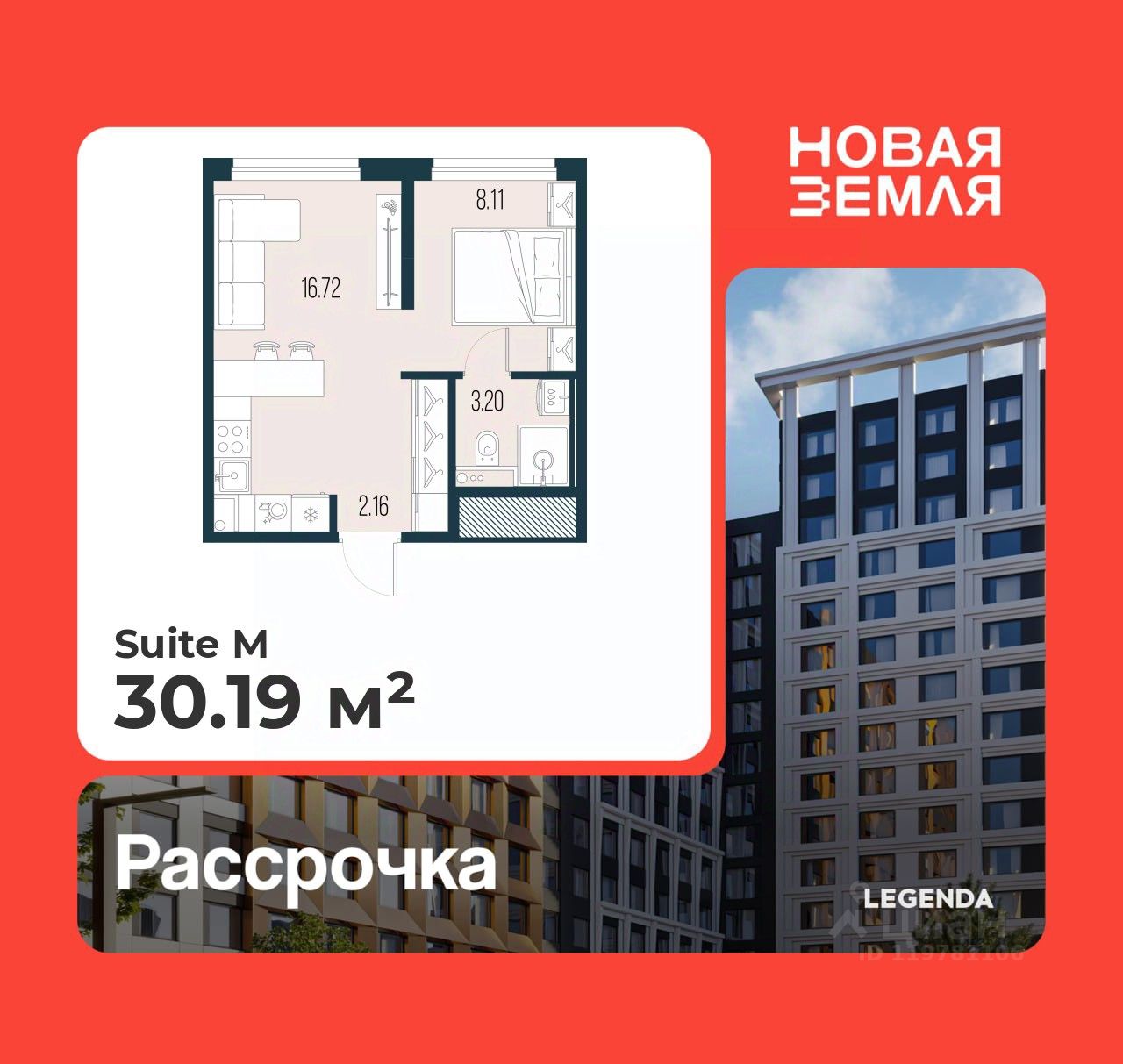 1-комн. квартира от застройщика с предчистовой отделкой в ЖК "Новая Земля" на 11 этаже. Общая площадь: 30.19 кв.м., жилая: 7.85 кв.м., площадь просторной кухни-столовой: 16.79 кв.м. Все окна выходят на одну сторону. В квартире один совмещенный санузел. Высота потолков 2.85 м.