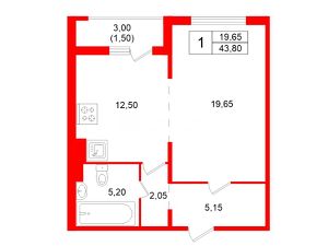 Общая площадь квартиры 43,8м2, комната 19,65м2, кухня-гостиная 12,5м2. Просторная прихожая , с зеркальным вместительным шкафом, 5,15м2.