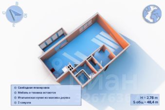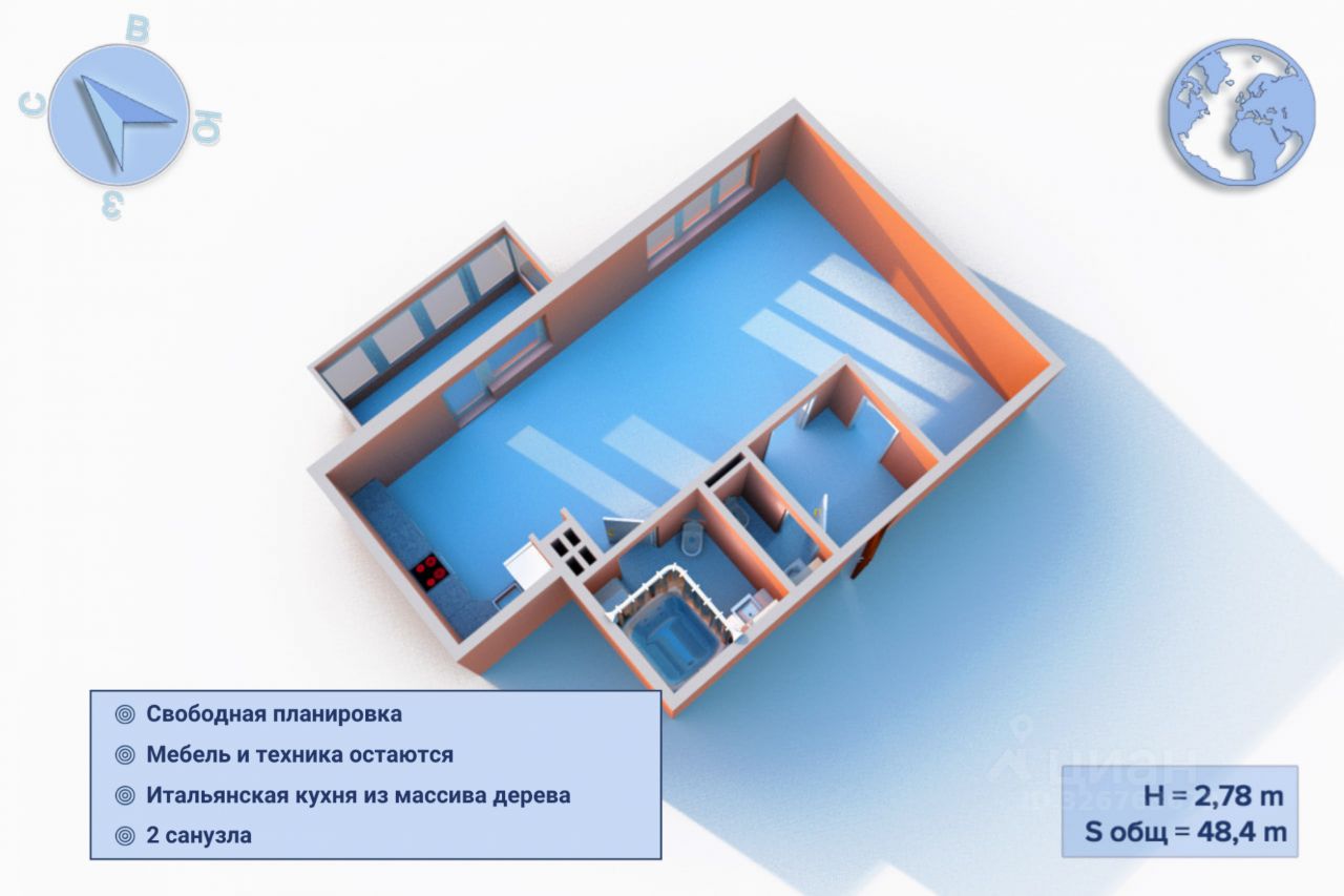 КВАРТИРА Площадь квартиры — 48,4 м², потолки 2,78 м. Свободная планировка, увеличенные дверные проемы и наличие трех больших окон обеспечивают хорошее естественное освещение и визуально расширяют пространство. Кухня из массива итальянского дерева, камин, мягкая мебель и вся бытовая техника: холодильник, плита, вытяжка, посудомоечная и стиральная машины остаются новому собственнику.