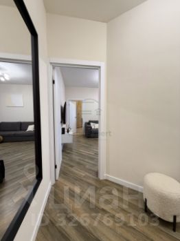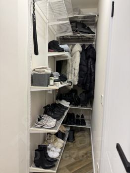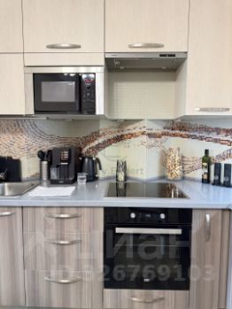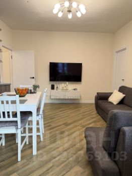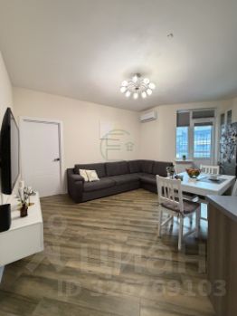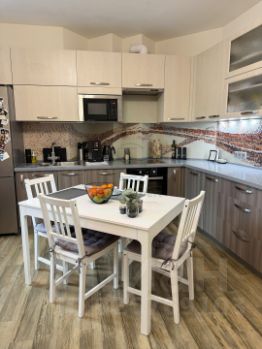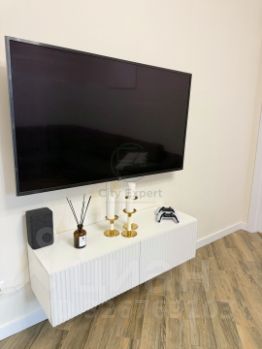 Планировка 2Е с большой кухней-гостиной и спальней. Свежий ремонт, замена дверей, плинтусов, установлен бойлер. В квартире остается вся мебель: диван в кухне гостиной, обеденный стол и стулья, кухня со встроенной техникой: духовой шкаф, варочная поверхность, посудомоечная машина, холодильник, кондиционер, все кроме телевизора. В спальне остается также мебель: шкаф, комод и кровать. В коридоре удобная ниша - зона хранения - гардеробная.