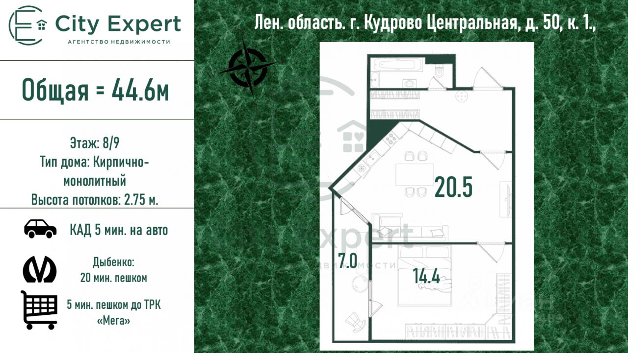 Рядом в 5 минутах планируется открытие станции метро. Ближайший дом к Меге и Мега-парку с красивой прогулочной зоной и детскими площадками. В Кудрово есть своя новая современная поликлиника. Рестораны, кафе, продуктовые магазины, 2 спортзала (3 и 7 мин пешком)все в шаговой доступности. До метро за 25-30 минут можно дойти пешком.