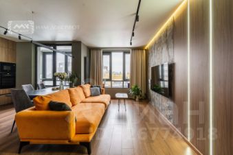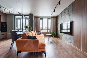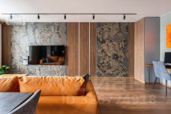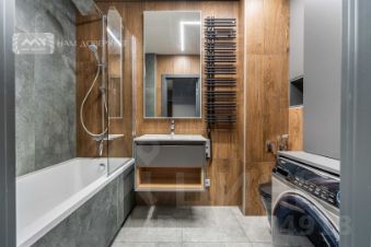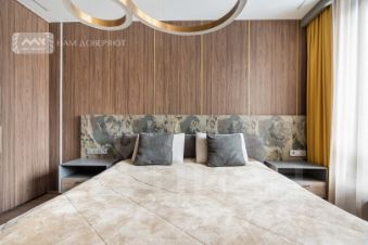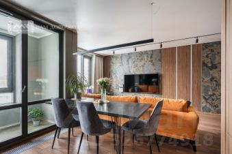 Вся мебель выполнена на заказ. В отделке - натуральный камень, натуральное дерево. На полу инженерная доска, теплый пол в ванной комнате и на лоджии.