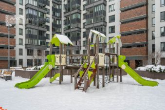 Территория дома закрыта от посторонних: здесь расположены детские площадки, фонтан и места для отдыха, высажены цветы. На первом этаже представлена самая разнообразная коммерция: кафе, пекарни, детские сады и клубы, салоны красоты, студия балета, пилатес-центр, спа и массаж.