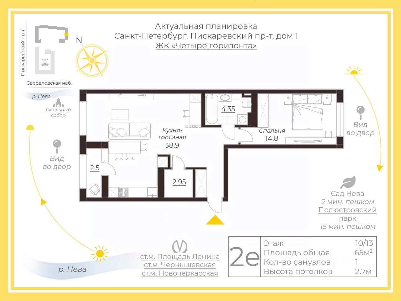 На лифте можно спуститься в паркинг. Центр города расположен всего в несколько минутах на авто. Прогулочная набережная с завораживающими видами на панораму города, свежий воздух с Невы, множество зеленых скверов и парков, близость центрального района - все это ежедневно будет наполнять вашу жизнь самыми теплыми эмоциями!