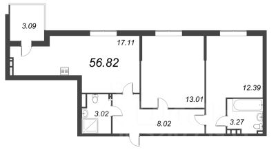 - Общая площадь - 56,82 кв.м без учета лоджии 3,09 кв.м