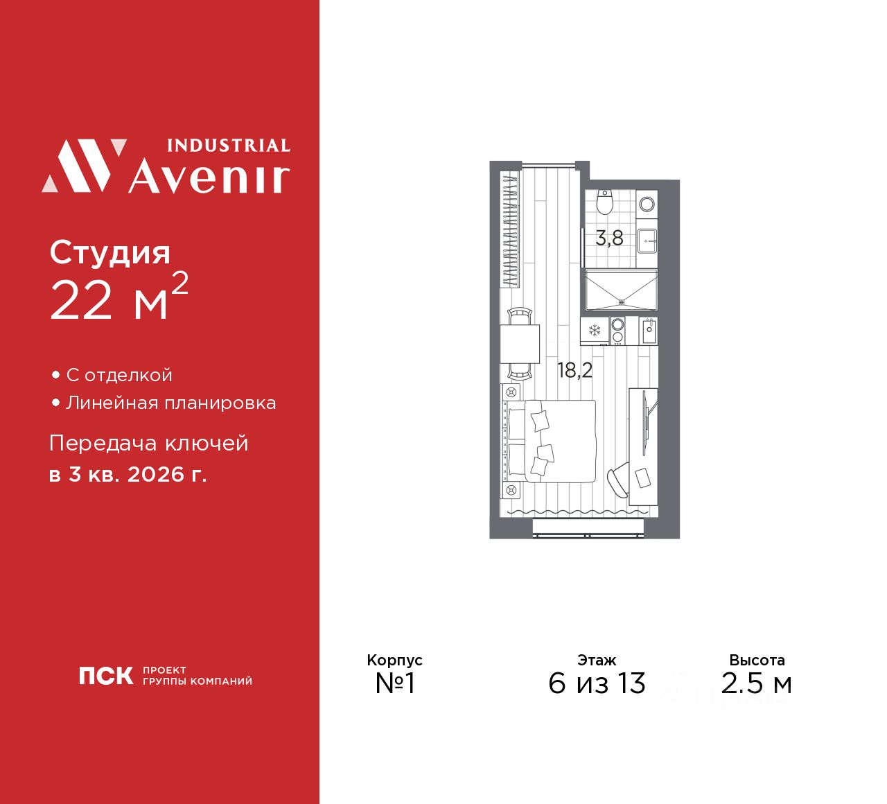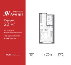 Однокомнатные апартаменты-студия с отделкой в ЖК "Industrial AVENIR" на 6 этаже. Общая площадь: 22 кв.м., площадь гостиной 18.2 кв.м., из которых 5 кв.м. выделено под кухонную зону. Все окна выходят на одну сторону. В апартаментах один совмещенный санузел. Высота потолков 2.5 м.