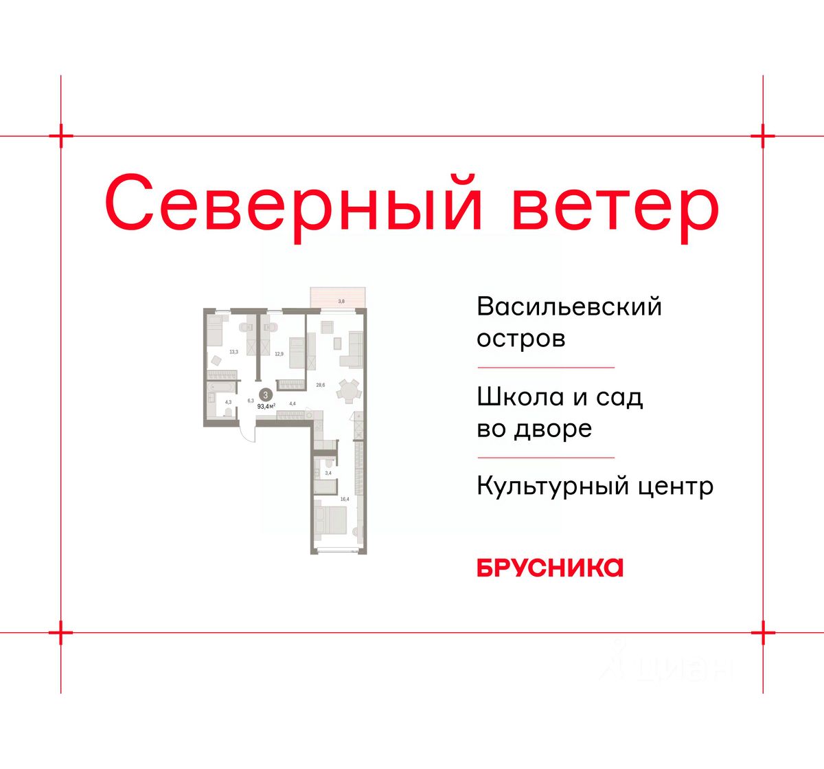 Трехкомнатная квартира от застройщика с предчистовой отделкой в ЖК "Северный ветер" на 3 этаже. Общая площадь: 93.35 кв.м., жилая: 42.6 кв.м., площадь просторной кухни-столовой: 28.6 кв.м. Квартира - распашонка, без проходных комнат, окна выходят на paзные стороны дома. В квартире один балкон, два совмещенных санузла. Высота потолков 2.72 м.