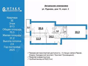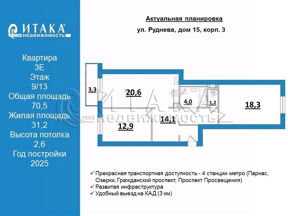 129071962 Продаётся 3-комнатная квартира просторной планировки по адресу: СПб, ул. Руднева, д.15 кор 3, Дом монолитный 2025 года. Этаж -9. Окна на улицу и во двор. Общая площадь 70,5 кв. м. Жилая площадь 31,2 кв. м (18,3+12,9), комнаты изолированные. Площадь кухни-столовой (изолированная,6 кв. м, что позволяет организовать техническую зону кухни и зону отдыха. Санузел раздельный. Площадь прихожей 14,1 кв. м. Застекленный балкон. Дом расположен в благоустроенном микрорайоне с готовой инфраструктурой. Прекрасная транспортная доступность - 4 станции метро (Парнас, Озерки, Гражданский проспект, Проспект Просвещения), остановки общественного транспорта, удобный выезд на КАД (3 км). Район обжитой, тихий, спокойный, удобный. Рядом расположен муниципальный детский сад. Закрытый двор. Лифты марки OTIS. Полная чистовая отделка хорошего качества. Возможна ипотека, семейная ипотека, использование материнского капитала.