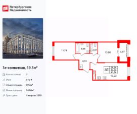Удобная, классическая, функциональная европланировка, большая кухня-гостиная 19.03 м², просторная прихожая 8.51 м². Общая площадь квартиры - 59.3 м², жилая 24.84 м², высота потолка 3 м.