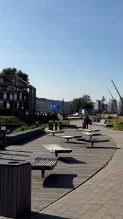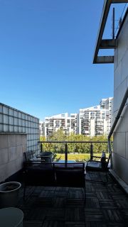 Из окон — не только вид на воду, но и обзор во внутренний двор: ухоженная территория, элитный спортзал и кафе прямо на территории комплекса. В квартире есть балкон и лоджия, а лоджия — порядка 12 м², где удобно устраивать завтраки и полноценную зону отдыха.