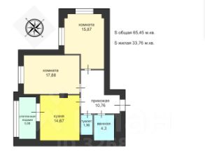 Общая площадь квартиры 65,8 м2 (по ЕГРН) , +лоджия 6 м2.