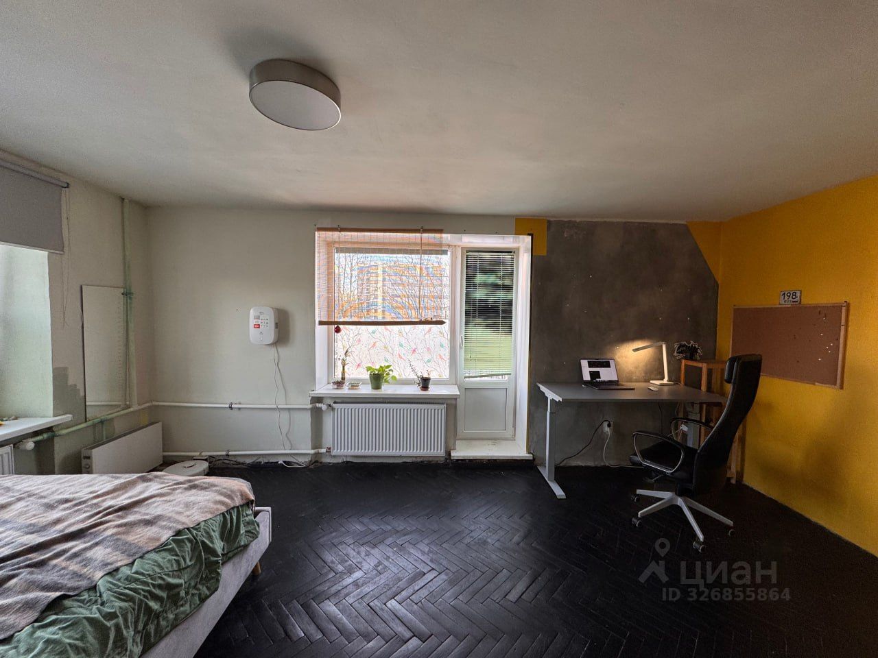 Комната 17.5 метров с двумя окнами и выходом на балкон, с которого открывается вид на тихий зеленый двор и новый ЖК.