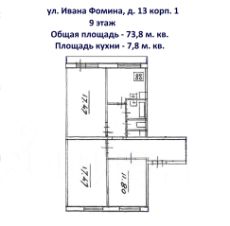 Общая площадь 73,8 м. кв. Окна выходят на 2 стороны.