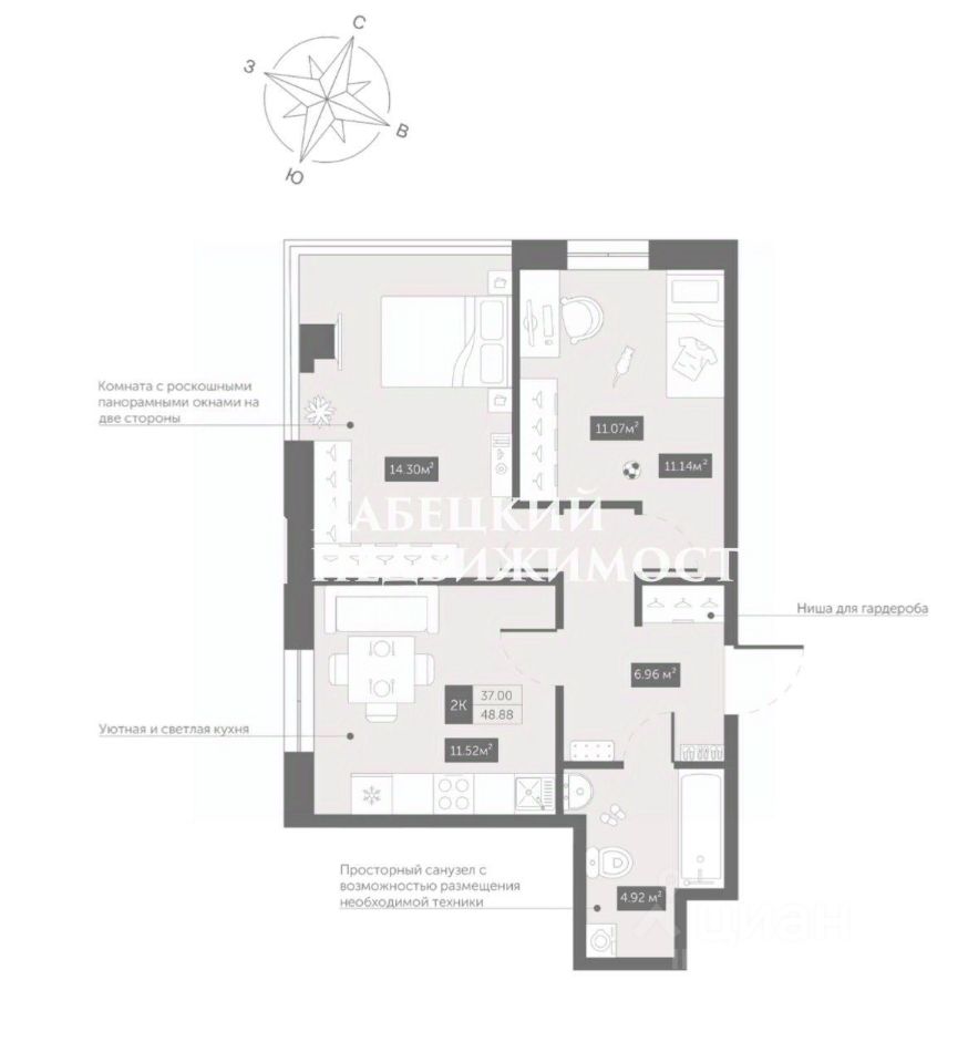 ПРОСТОРНАЯ, СВЕТЛАЯ двухкомнатная квартира общей площадью 48.88 м² с действительно КОМФОРТНОЙ планировкой. ДВЕ ИЗОЛИРОВАННЫЕ КОМНАТЫ с ПАНОРАМНЫМ остеклением 14.34+11.14 м², ПРОСТОРНЫЙ санузел 4.92 м², кухня ПРАВИЛЬНОЙ формы 11.52 м² и ШИРОКАЯ прихожая с множеством мест для хранения вещей 6.96 м²