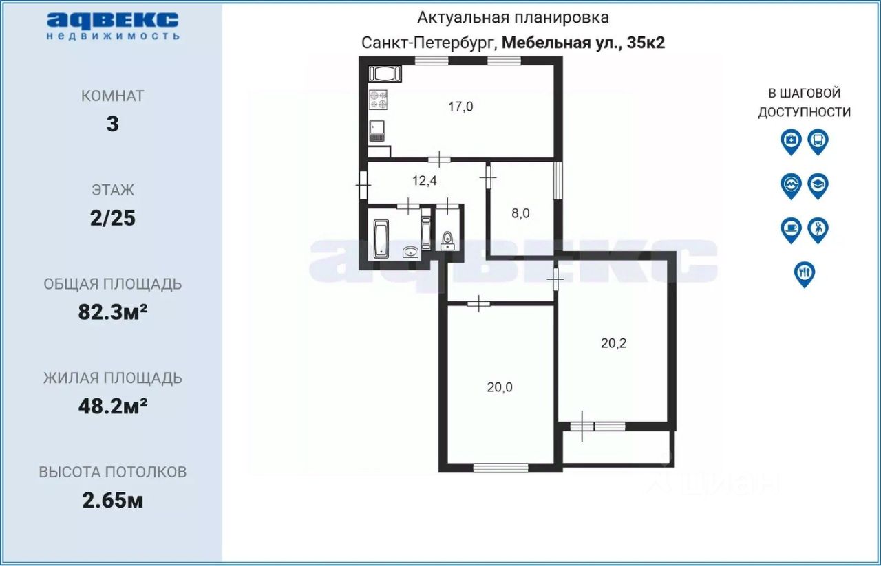 Три полноценные комнаты. Две спальни по 20 м2 и уютный кабинет (8 м2).