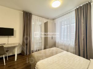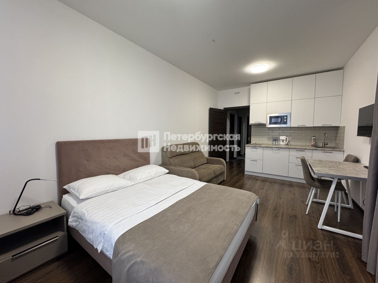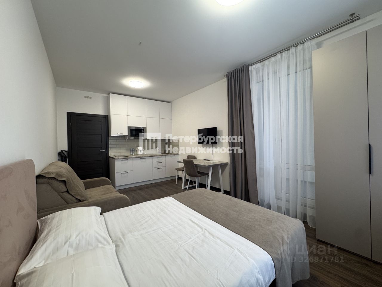 В комнате установлена встроенная качественная кухня с техникой, распашной шкаф, двухспальная кровать и компактный диван, который раскладывается. Так же есть обеденная зона и телевизор.