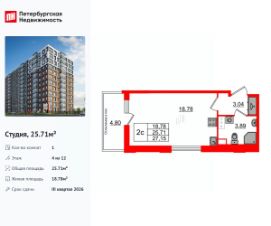 Удобная, классическая, функциональная европланировка, вместительная прихожая 3.04 м². Общая площадь студии - 25.71 м², жилая 18.78 м², высота потолка 2.77 м.