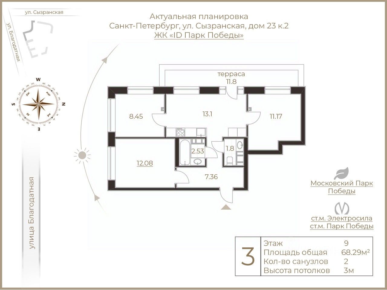 Арт. 129994641 Уважаемый Покупатель, предлагается вашему вниманию Видовая 3-х комнатная квартира в шаговой доступности от легендарного Парка Победы с многочисленными прогулочными маршрутами, популярными культурными площадками и общественными пространствами, в жилом комплексе ID Park Pobedy клубном квартале в престижном Московском районе Санкт- Петербурга. О комплексе: ЖК iD Park Pobedy - комплекс бизнес класса, предлагает всё необходимое для повседневного комфорта, активного отдыха и гармоничного развития: закрытая территория с детским садом и государственной школой, всесезонные общественные пространства на открытом воздухе с wi-fi, современные игровые площадки и воркауты, винотека, отделения банков, модные салоны красоты, закрытая территория с контролем доступа, видеодомофоны и камеры наблюдения во дворе, входных зонах и паркинге. Потрясающие дизайнерские холлы и места общего пользования. В ЖК уже работают магазин Магнит, детский сад, магазины цветов, стоматология, ПВЗ и многое другое. О самой квартире! Терраса, Терраса- только в этой квартире видовая, просторная, площадь которой позволяет поставить кофейный столик , шезлонги и вечнозеленные растения . Основные характеристики: Площадь 68 м2 Этаж 9 терраса-11,8 м2, идеально подходит для любования перспективой города кухня-гостиная - 13 м2 с панорамным остеклением, дающие максимум света и открытых горизонтов. Спальня - 12м2 Кабинет -9 м2 Детская/ вторая спальня -11м2 В квартире выполнен новый ремонт в современных спокойных интерьерных тонах, кухня-гостиная и комнаты обустроены стильной мебелью и техникой, раздельный санузел с качественной сантехникой. Панорамное остекление в кухне- гостиной позволяет создавать уютную атмосферу , открывают потрясающие виды на панораму города, наполняя помещение естественным светом. ОБРАТИТЕ ВНИМАНИЕ, квартира с отличительными видовыми характеристиками , благодаря панорамному остеклению и большой террасе, с которой открываются умопомрачительные виды на крыши Петербурга. Квартира подойдёт, как для молодой пары ,так и идеальная для семьи с детьми . О районе: Стоит обратить внимание на районе, в котором расположился ЖК ID Park Pobedy- Московском районе, который является одним из ПРЕСТИЖНЫХ мест для проживания. Его полюбили за старинную архитектуру, ухоженную территорию и разнообразную инфраструктуру, большое количество зеленых насаждений, близость к центру. Еще лучше жить в Московском районе, потому что здесь сфокусированы культурно-досуговые заведения. Удобства Московского района оценивают на десятку. Переехав с семьей, вы найдете уютные, незагазованный квартал, где вам будет комфортно с детьми. Искателям приключений будут по нраву местные тусовки, которые расположены на набережной Обводного канала, проспектах Московский, Дунайский, Космонавтов, площади Конституции. О сделке: Квартира в собственности. Один взрослый собственник. Готовы к быстрой сделке, обременений нет. Полное юридическое сопровождение!