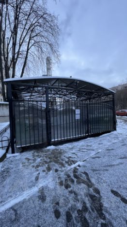 Помойка находиться в отдельно-отведенном, огороженном месте. Закрывается на домофоный ключ. Установлен световой прожектор с датчиком движения и света.