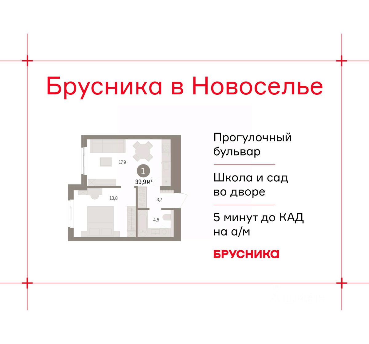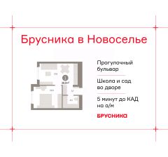 1-комн. квартира с предчистовой отделкой в ЖК "Брусника в Новоселье" на 2 этаже. Общая площадь: 39.85 кв.м., жилая: 13.8 кв.м., площадь просторной кухни-столовой: 17.9 кв.м. Все окна выходят на одну сторону. В квартире один совмещенный санузел. Высота потолков 2.7 м.