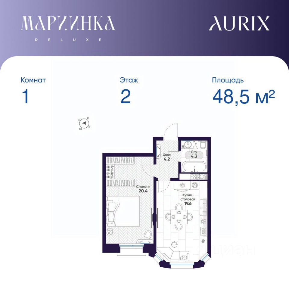 Общая площадь квартиры — 48.5 кв. м, этаж 2 из 9.