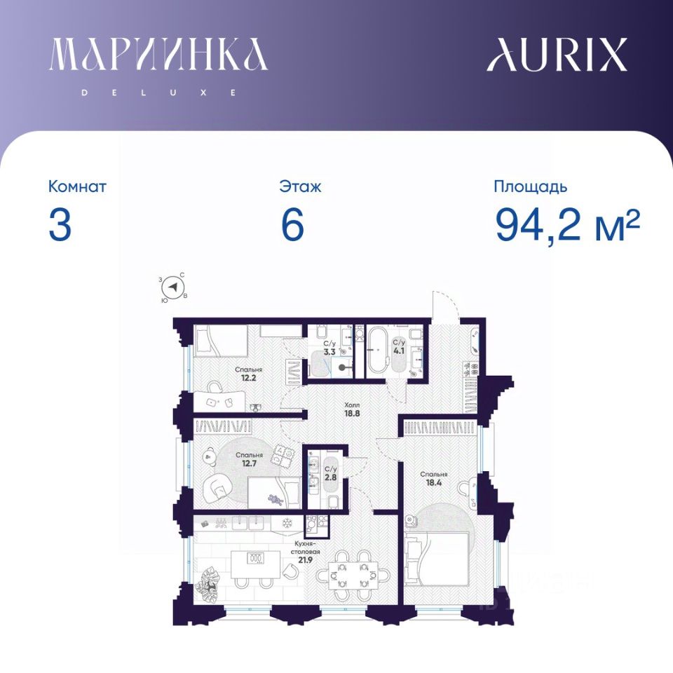 Общая площадь квартиры — 94.2 кв. м, этаж 6 из 9.
