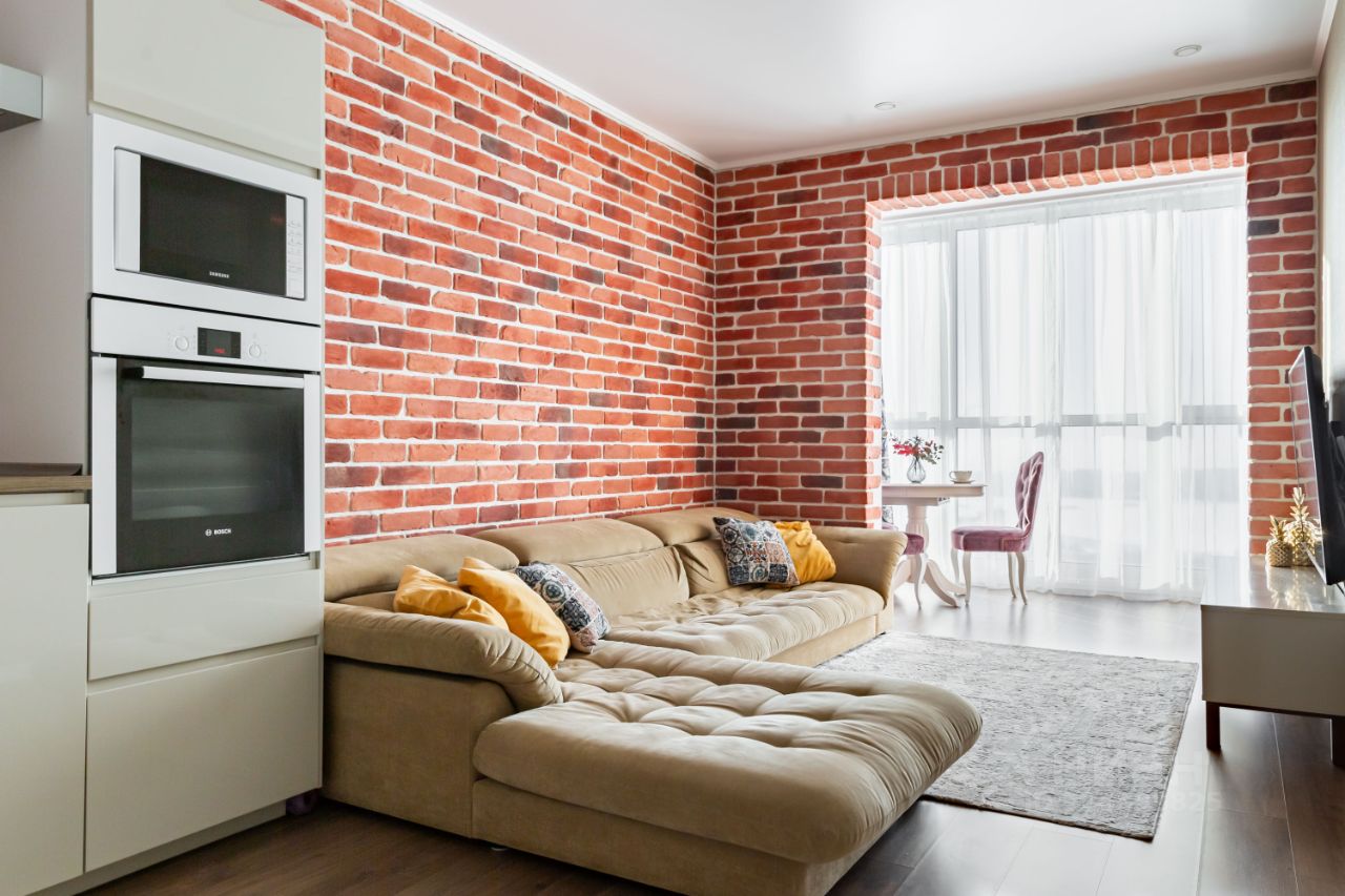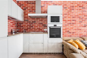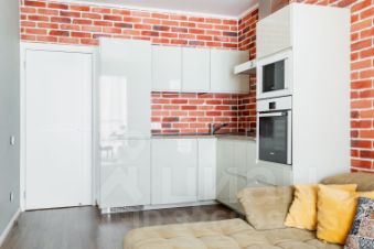 Кухня-гостиная (22 м²): Стеклянный фасад, волшебные закаты над заливом.