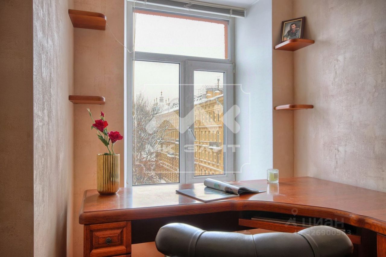 Небольшой, но невероятно уютный кабинет - с одной стороны камин, с другой - вид на Смольный собор прямо за рабочим столом.