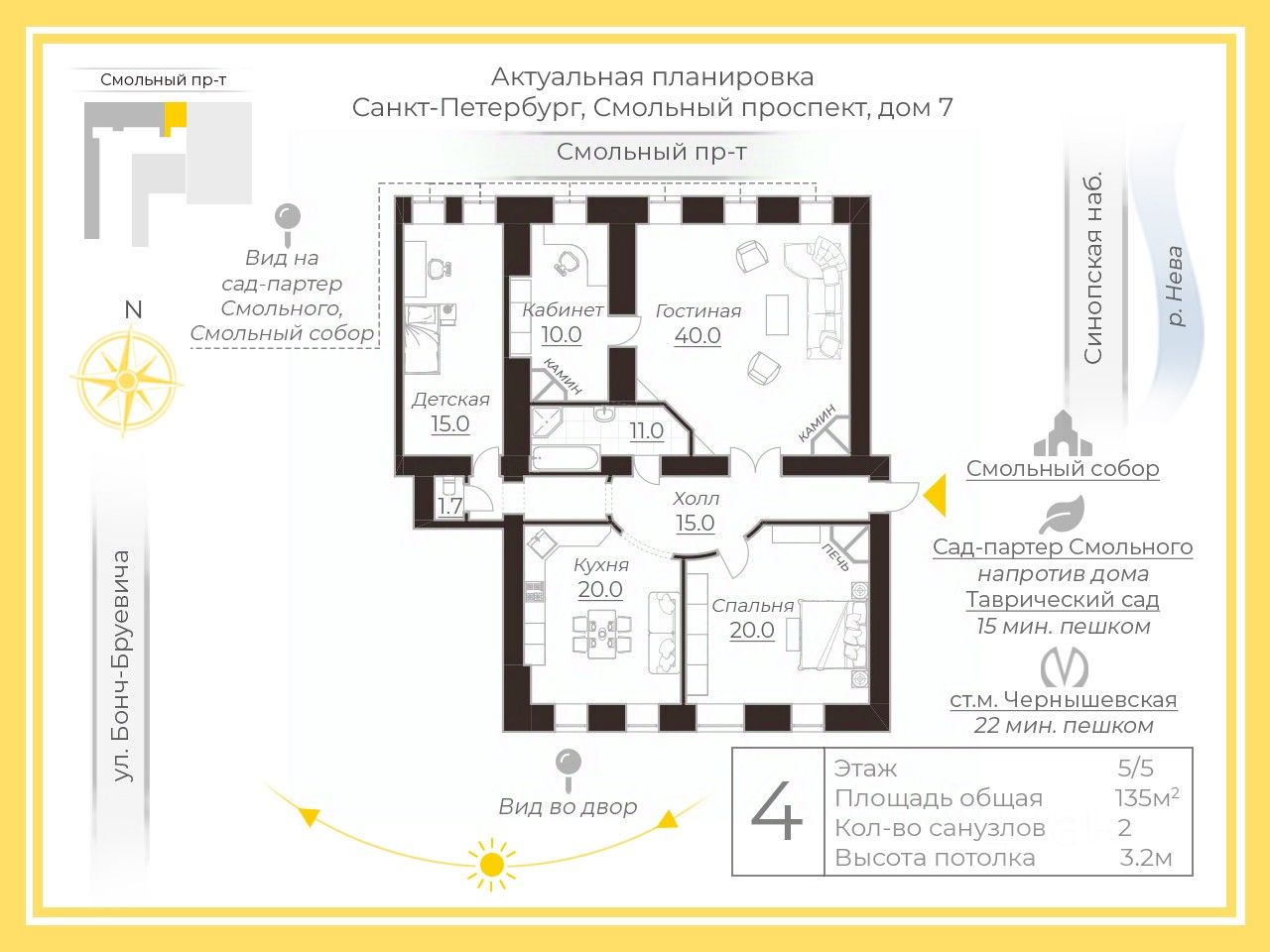 Уникальная квартира у Смольного собора, имеющая аж два камина: в зале и кабинете, а также изразцовую печь в спальне. Слово "зал", заявлено неспроста, ведь это огромная гостиная на 3 окна, площадью 49 кв.м, с деревянной распашной дверью и камином при входе.