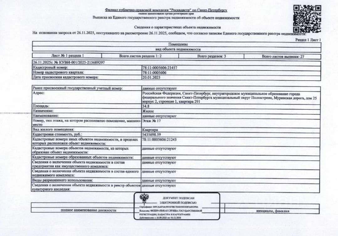 Подвергнутое аресту принадлежащее должникам Муллинову И. В., Муллиновой Е.А. находящееся в залоге у ПАО БАНК ВТБ имущество: квартира общей пл.34.80 кв.м.кад. 78:11:0005606:21457 расположенная по адресу: Санкт-Петербург, внутригородское муниципальное образование города федерального значения Санкт-Петербурга муниципальный округ Полюстрово, Муринская дорога, дом 25 корпус 2, строение 1, квартира 291 г.п 2023, Информация о задолженности по взносам на капитальный ремонт ФССП не предоставлена. Согласно представленной ФССП форме 9ф от 27.11.2025 занимаемом помещение зарегистрировано 4 человек из них 2 несовершеннолетние. Обременение: ипотека, запреты регистрационных действий ФССП.