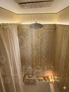 Стены и потолки: комбинация дизайнерских обоев Aura и классической лепнины. Многоуровневые потолки со сложными сценариями освещения (RGB-подсветка, диммируемый свет) позволяют менять настроение интерьера одним касанием.