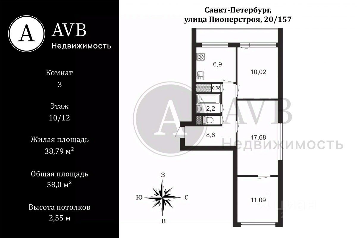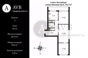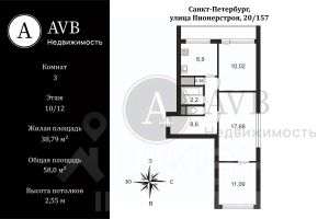 Продаётся трёхкомнатная квартира на 10-м этаже 12-этажного кирпичного дома площадью 58 м². Две комнаты смежные, одна — изолированная. Окна выходят на три стороны, обеспечивая отличный открытый вид, не перекрытый соседними домами.