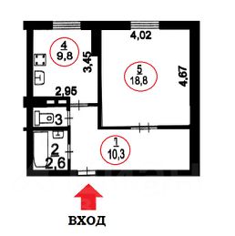 Жилая комната - 18,8 кв.м., кухня - 9,8 кв.м., прихожая - 10,3 кв.м.