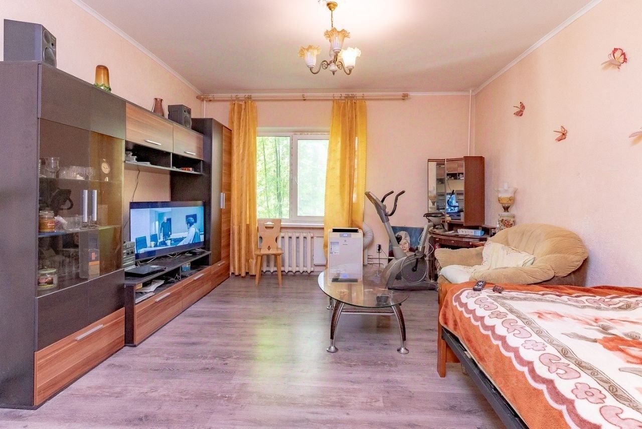 Квартира расположено на 1-ом этаже с высоким цоколем, дом 6-ти этажный, год постройки - 2004 года, общей площадью 42,8 кв.м, с большой комнатой и просторной кухней, а перед окнами вид на огромные ели и сосны, дорогу не видно, чистая парадная, очень высокий цоколь.