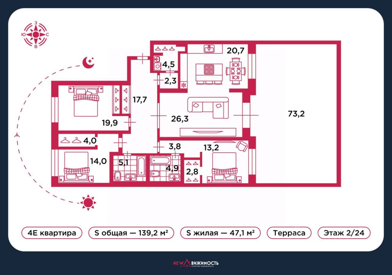 Общая площадь: 139,2 м². Жилая: 47,1 м². Этаж: 2 из 24.