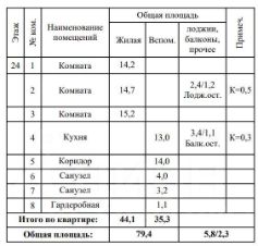 Общая площадь составляет 79,4 м2, в нее не включены балкон(3,4м2) и лоджия(2,4).