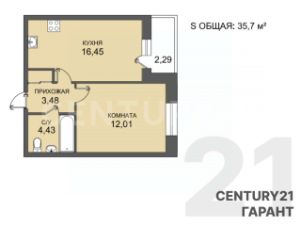 Общaя площaдь: 35,7 кв. м.