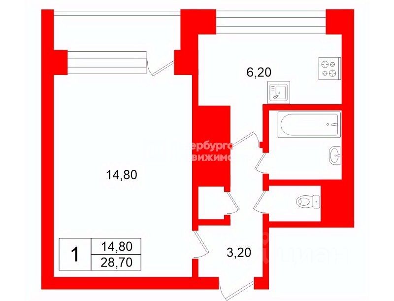 Общая площадь — 27,6 м2, жилая — 16,2 м2