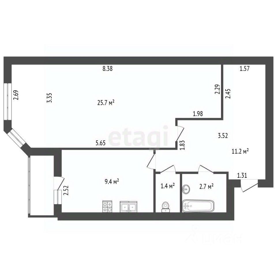 Комнаты: Просторная комната, отдельная кухня с выходом на балкон.