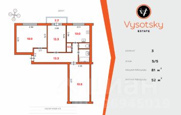 - просторные комнаты 19.9м2, 19.8м2 и 12.3 м2;