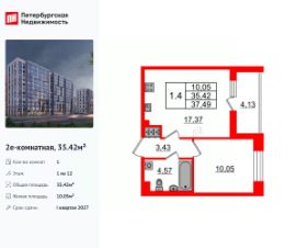 Удобная, классическая, функциональная европланировка, большая кухня-гостиная 17.37 м², вместительная прихожая 3.43 м². Общая площадь квартиры - 35.42 м², жилая 10.05 м², высота потолка 2.77 м.
