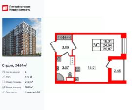 Удобная, классическая, функциональная европланировка, вместительная прихожая 3.06 м². Общая площадь студии - 24.64 м², жилая 18.01 м², высота потолка 2.77 м.