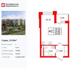 Удобная, классическая, функциональная европланировка, вместительная прихожая 3.08 м². Общая площадь студии - 24.98 м², жилая 18.16 м², высота потолка 2.77 м.