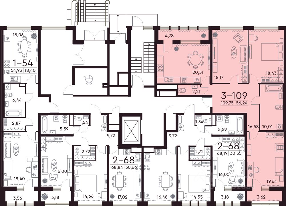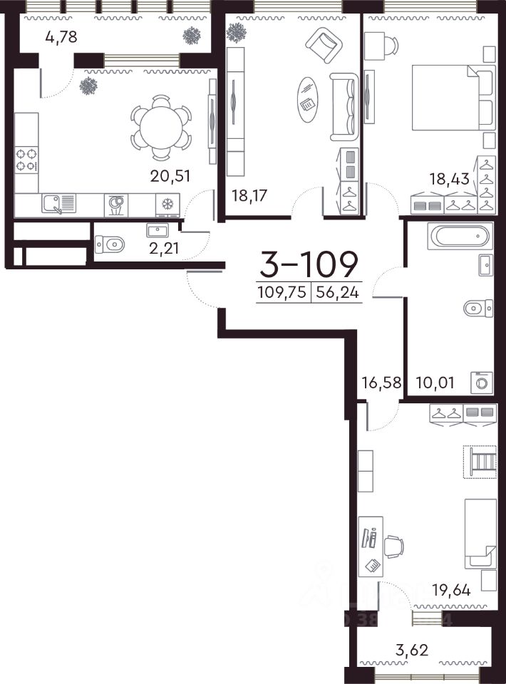 Квартира находится в 8 этажном доме, в Дом 3 на 2 этаже. Общая площадь квартиры 110,10 кв.м.